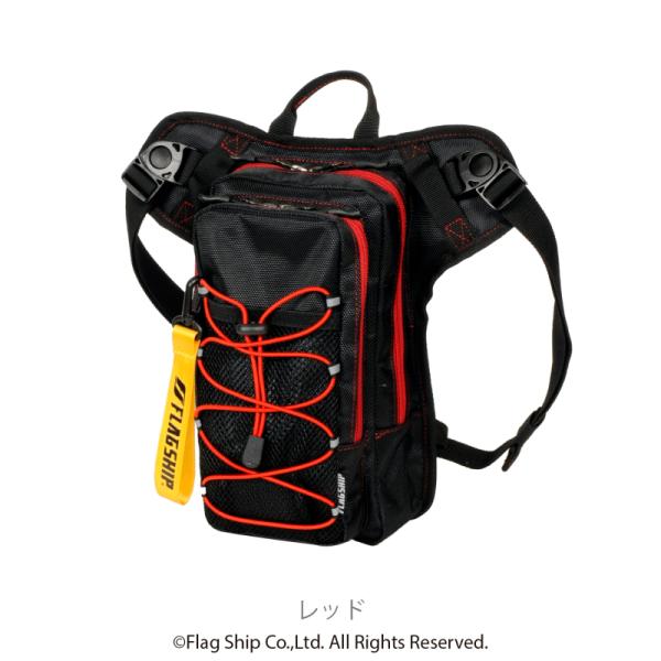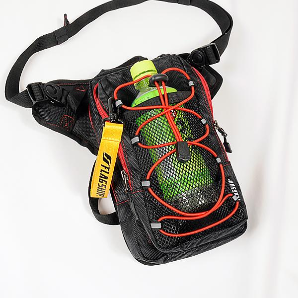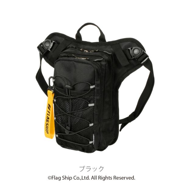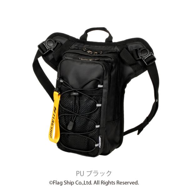 長財布も収納可能な2ポケット。外側にはメッシュポケットとドローコードを備えペットボトルやグローブの保持に便利。印象的なリボンタグ付き。ライディングシーンに応じてレッグバッグとしてもボディーバッグとしても使える2WAY仕様。