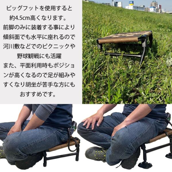AGURAユーザーの声から生まれたビッグフットは柔らかな地面での脚部の沈下で座面下がりを防ぐと共に微妙な地面の凹凸に対応します。