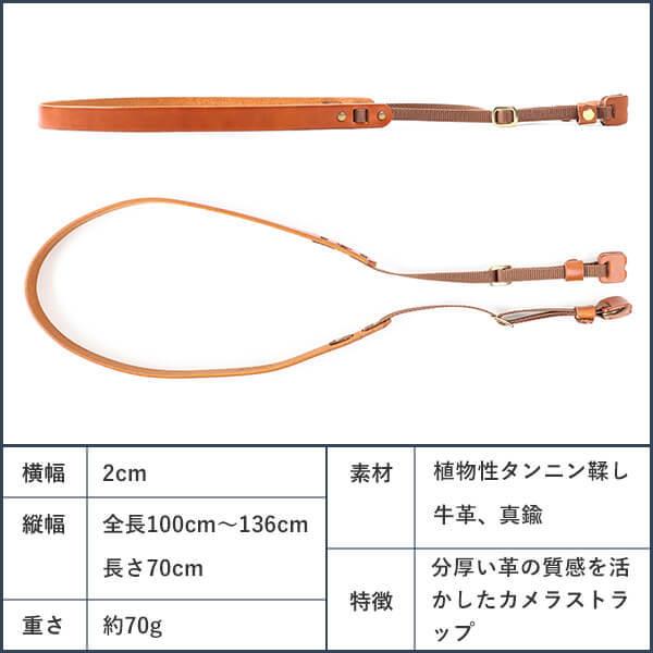 一眼レフ用* 耐荷重5kg(革の経年劣化により長期ご使用いただくと多少変化します) ストラップの長さは約100 〜 136cmまで調節可能
