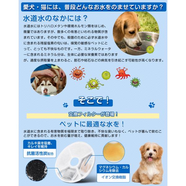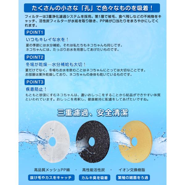 不織布が被毛・ホコリ・食べカスなどの不純物をキャッチし、活性炭がニオイや汚れを吸着。さらにイオン交換樹脂が水道水中のマグネシウム・カルシウムを抑え、飲みやすい水へ整えます。