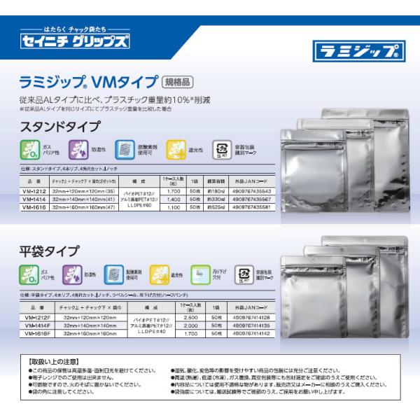 ラミジップ アルミ蒸着(VM)タイプ スタンドパック チャック袋 50枚 VM-1414