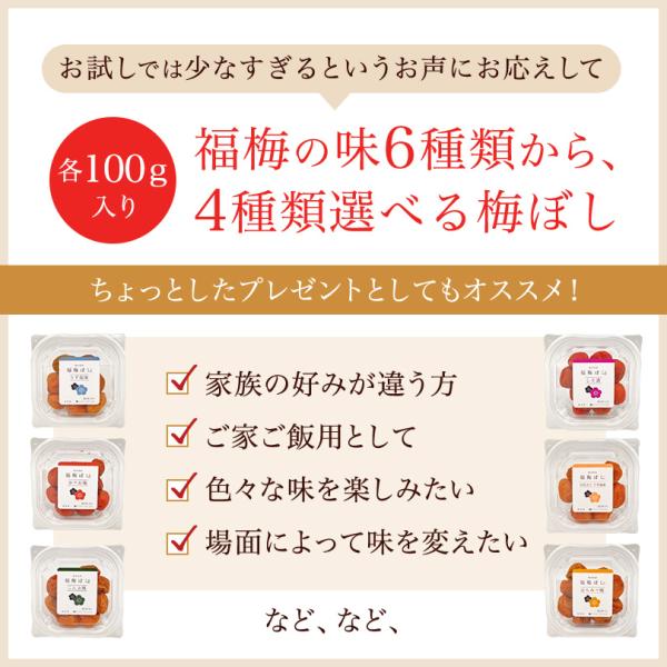 梅干し 梅ぼし生活 選べる組合せ 福梅ぼし梅干し食べ比べセット各100gx4味 食べ比べ/ご飯のお供/酸っぱい/福井県産紅映梅/