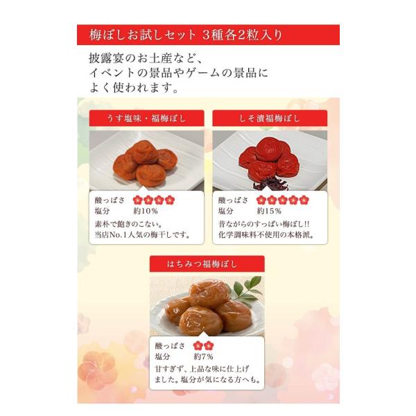 爆買 種が小さく果肉が豊かな「福井県産紅映梅」を昔ながらの製法で漬けたしそ漬け、塩分を控えたうす塩味、ほんのり甘いはちみつ梅、の3種類の梅ぼしが楽しめるプチギフトです。