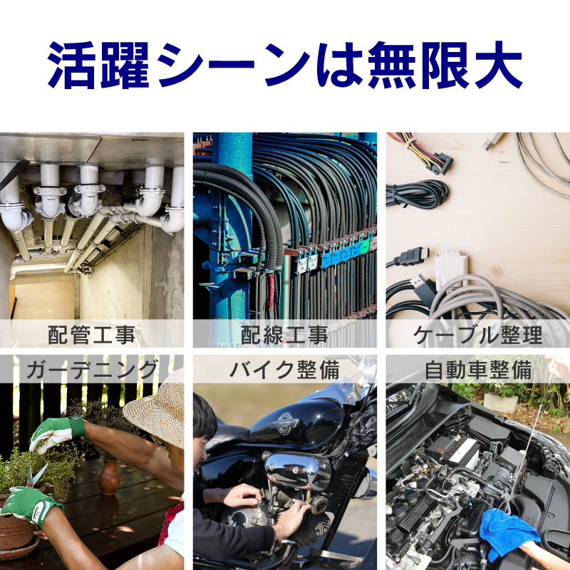 配管工事、配線工事、ケーブル整理、ガーデニング、バイク整備、自動車整備など様々な場面で大活躍