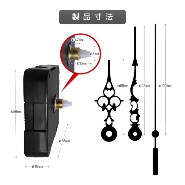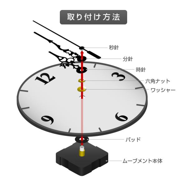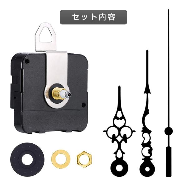 セット内容:ムーブメント、秒針、分針、時針、パッド、ワッシャー、六角ナット、フック