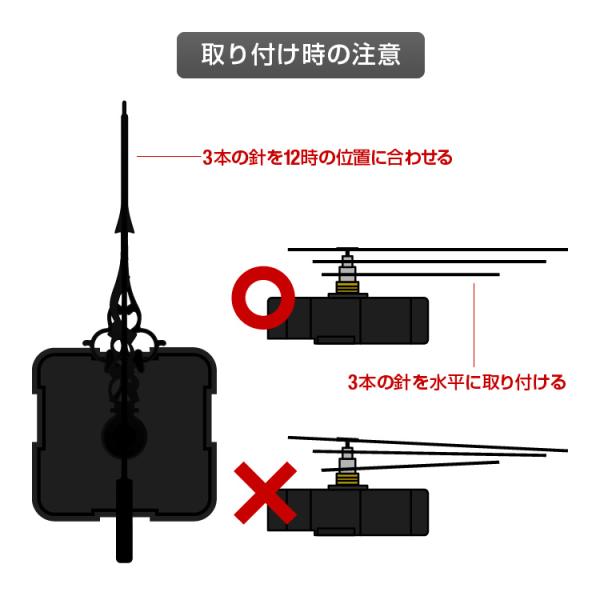 3)時針、分針、秒針を12時の位置に合わせ水平になるように取り付けて完成
