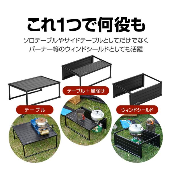 天板をサイドに取付けでき、テーブル、テーブル+風除け、ウィンドシールド等幅広い用途で活躍