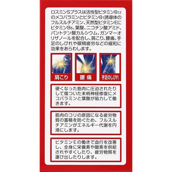 ロスミンSプラスは末梢神経修復に関与する活性型ビタミンB12のメコバラミンと葉酸、筋肉のコリの原因になる疲労物質の蓄積を防ぐビタミンB1誘導体のフルスルチアミンや天然型ビタミンE、ビタミンB6、ニコチン酸アミド、パントテン酸カルシウム、自律神経の働きを助けるガンマ-オリザノールを配合していますので、肩こり、腰痛、手足のしびれや眼精疲労などを緩和します。