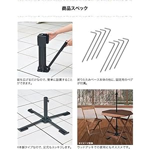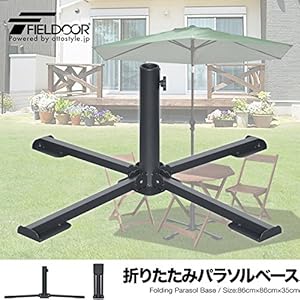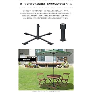 ガーデンパラソルの必需品!折りたたみパラソルベース テラスやアウトドアで使用するガーデンパラソル用の折りたたみベースです。 こちらのパラソルベースは、持ち運びや使わない時の収納に便利な折りたたみタイプ。 組み立ては工具を使用することなく、脚を広げるだけなのでとっても簡単です。 また、脚部にはペグや木ネジ等で固定する時のために穴が施されています。 持ち運び・収納時に、 便利な折りたたみタイプ! 折りたたみタイプなので、持ち運びにとっても便利! 女性でも簡単に移動することができます。 また、コンパクトサイズになることで未使用時の収納にも困りません。 商品スペック ・脚を広げるだけなので、簡単に設置することができます。 ・折りたたみベース本体の他に、固定用のペグが付属。 ・4本脚タイプなので、足元もスッキリします。 ・ウッドデッキでの使用にもオススメです。 ウッドデッキでの使用について 折りたたみパラソルベースはウッドデッキでの使用にもオススメです。 脚部には固定する用の穴が施されているのでウッドデッキにて使用する際は、必ず木ネジ等で固定してご使用ください。