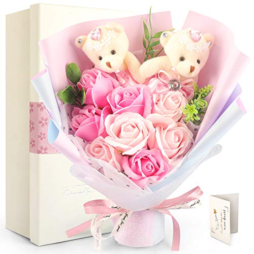 FAUHAL 675 view FAUHAL ソープフラワー ベア 枯れない花 石鹸 花 バラ 造花 花束くま束 ブーケ ぬいぐるみ(ベア2匹、ローズ8輪) 创意プレゼント結婚式 記念日 デート お盆 教師の日 お子さんに バレン