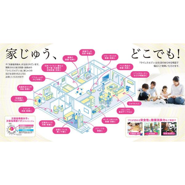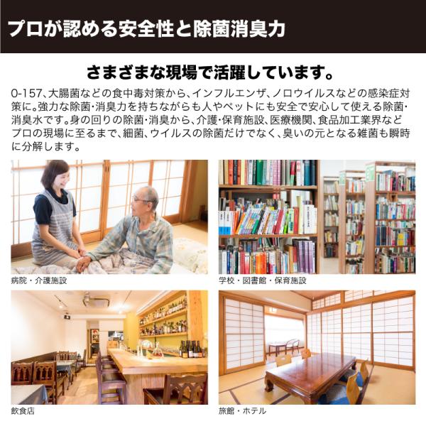 0-157、大腸菌などの食中毒対策から、インフルエンザ、ノロウイルスなどの感染症対策に。強力な除菌・消臭力を持ちながらも人やペットにも安全で安心して使える除菌・消臭水です。身の回りの除菌・消臭から、介護・保育施設、医療機関、食品加工業界、歯医者さんなどプロの現場に至るまで、細菌、ウイルスの除菌だけでなく、臭いの元となる雑菌も瞬時に分解します。