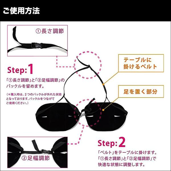 高速バス・深夜バス・飛行機・新幹線などの長時間の移動やフライト中の狭い空間で両足をリラックスさせる持ち運び簡単で機内にも持ち込める携帯用トラベルグッズ。使い方は簡単で前席に備え付けられているテーブルに引っ掛けるだけの簡単な旅行用便利グッズです。