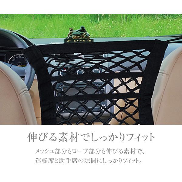 【伸びる素材でしっかりフィット】メッシュ部分もロープ部分も伸びる素材で、運転席と助手席の隙間にしっかりフィット。