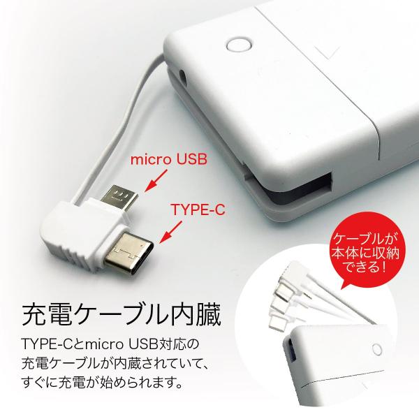 TYPE-CとmicroUSB対応の充電ケーブルが内蔵されていて、すぐに充電が始められます。