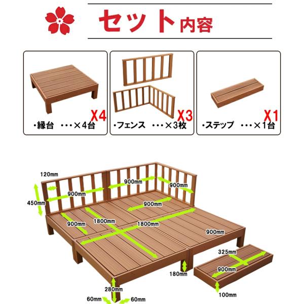 人工木製のウッドデッキセットです、縁台+フェンス(柵)+ステップが全てセットになっているので、他の材料は必要なく完成するdiyキットセットです。設置や組み立て簡単で塗料を塗る必要もなく、お庭やベランダ、バルコニーなど様々な場所をおしゃれに彩ります。