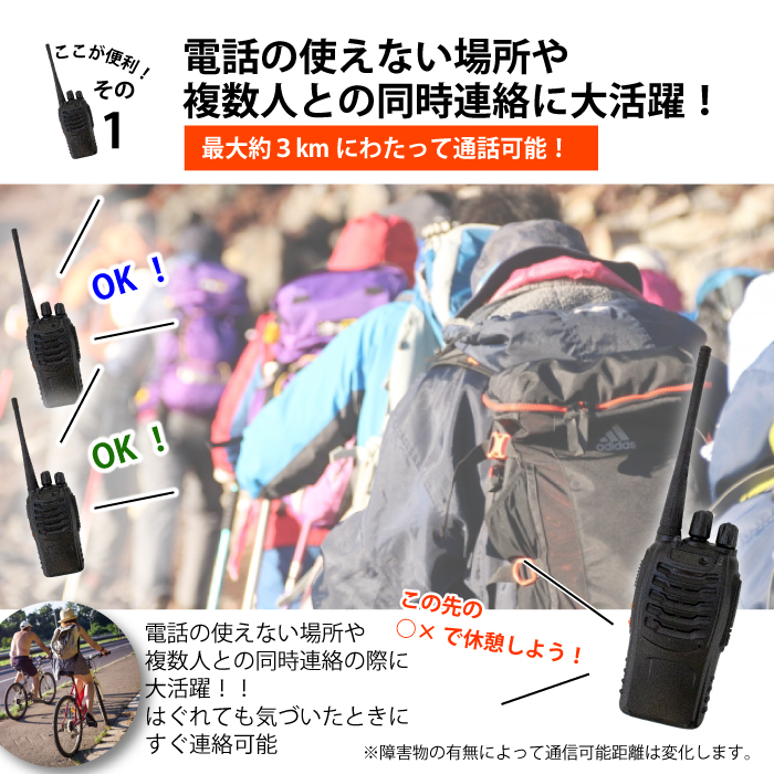・最大3キロの通信範囲!しっかり届き、相手の声がはっきり聞こえます!