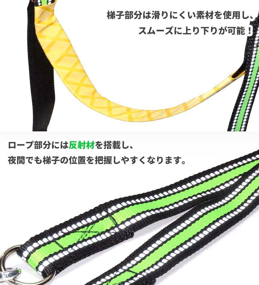 ロープのサイド部分には反射材を搭載し、夜間でも梯子の位置を把握しやすくなっております。