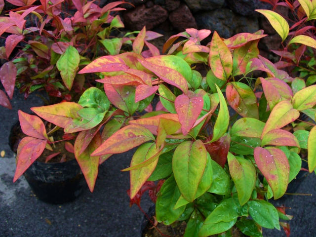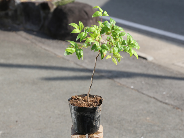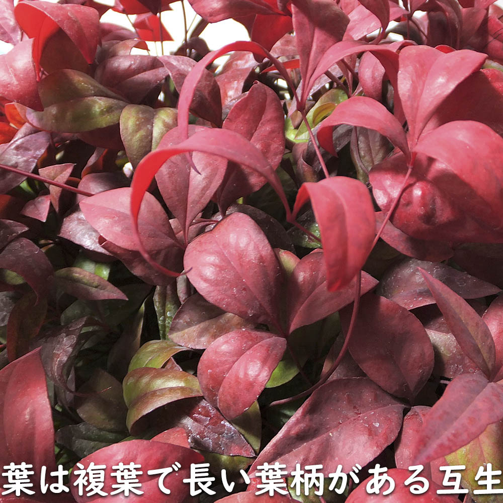 【オタフクナンテン】(お多福南天) 読み:おたふくなんてん 学名:Nandina domestica 'Otafukunanten' メギ科ナンテン属 常緑低木 別名:オカメナンテン、ゴシキナンテン 【名前の由来】 葉がナンテンよりも丸く幅広い様子を、お多福面に例えたことから。 【商品情報】 オタフクナンテンはナンテンの別種で葉は広く丸みがあります。冬の霜に当たると葉が赤く変化し、庭をにぎやかにしてくれます。耐寒性ももありますし半日陰でもよく育ちます。逆に日陰ではあまり色がでません。縦に大きくならず横に大きくなります。『難転』で災難を転ずる縁起木でもあります。一般的に寄せて植えてグランドカバーにするか、花壇に植え込んだり、アプローチなどに沿って植え込むという使われ方をします。1本だけでも赤く見栄えがするのでアレンジの仕方は多彩です。
