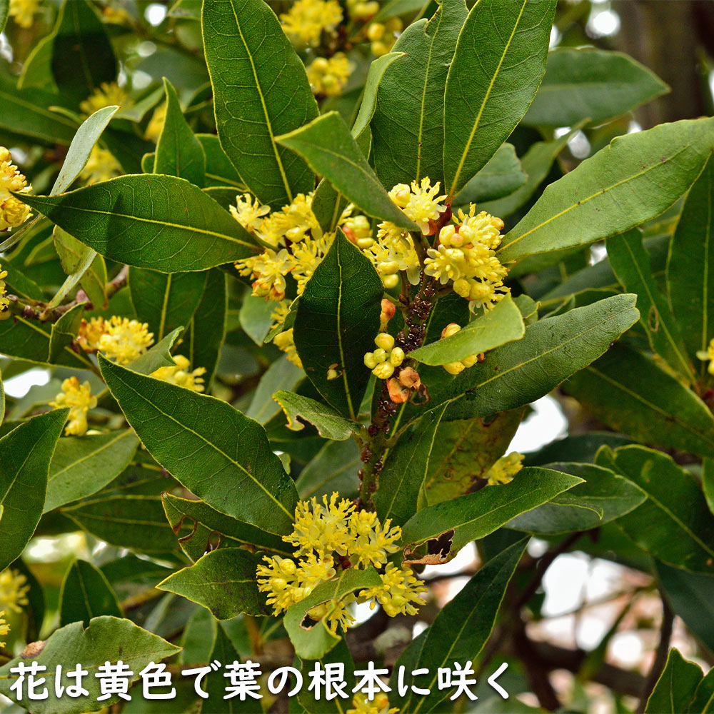 【ゲッケイジュ】(月桂樹) 読み:げっけいじゅ 学名:Laurus nobilis クスノキ科ゲッケイジュ属 常緑高木 別名:セイヨウニッケイ、ベイ、ベイリーフ、ローレル、ローリエ 【商品情報】 ゲッケイジュは勝利の冠で知られる黄金葉をつける品種です。暖かくて湿潤な気候を好む樹木です。風あたりに弱く、とくに土壌が浅いところでは倒れやすいのであまり高くならないように剪定するか、支柱を立てて支えます。芽吹く力が非常に強く、枝の伸びる勢いも強いので年に2〜3回剪定を行います。