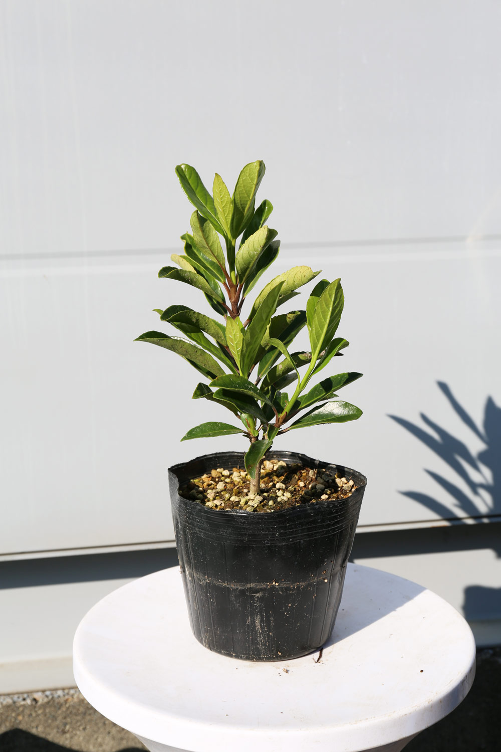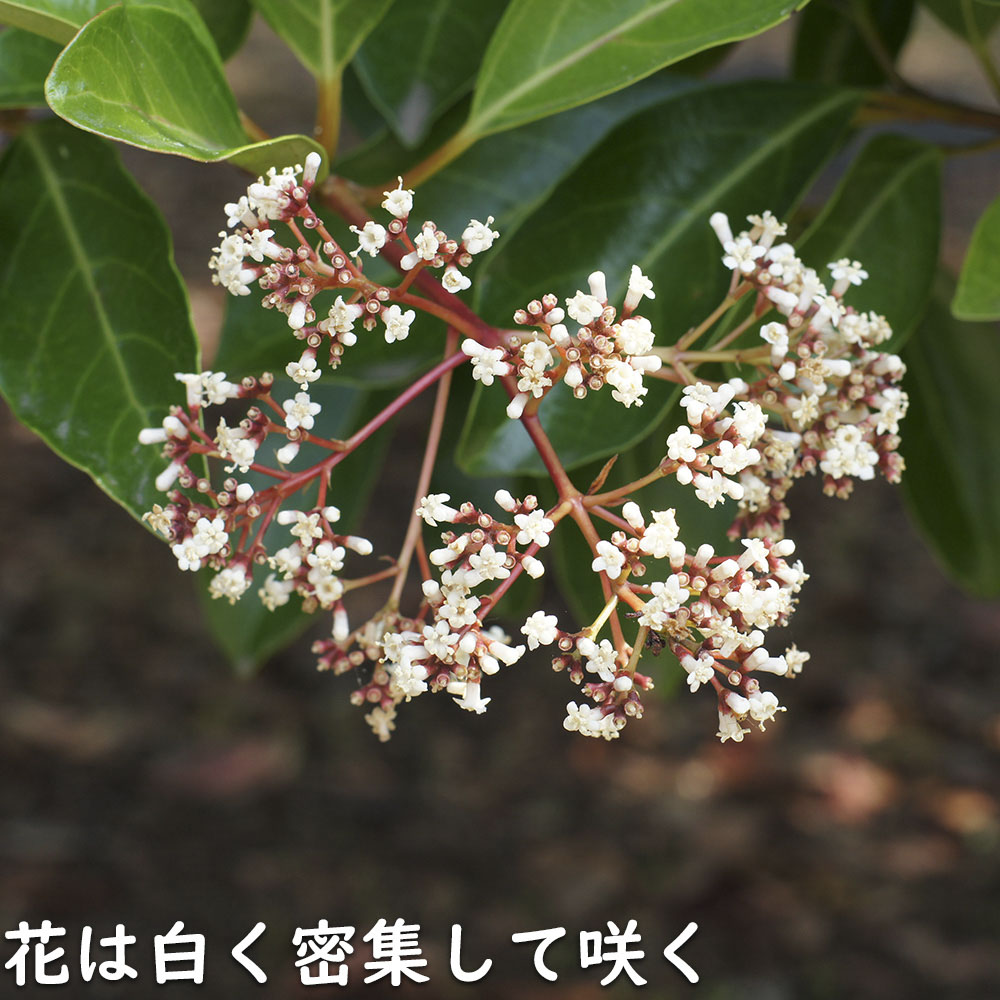 【サンゴジュ】 読み:さんごじゅ 学名:Viburnum odoratissimum var. awabuki スイカズラ科ガマズミ属 常緑高木 【商品情報】 サンゴジュは6月頃に白い花を咲かせます。8〜10月頃に小さな赤色の実がつきます。濃い緑色の葉と実の色を見比べてサンゴジュという名前がついたそうです。排気ガスや潮風などの過酷な環境に強く昔から人気がある品種です。葉にはたくさんの水分が含まれていて防火のためにもなります。とても萌芽力が強く成長しやすいですが、放置すると樹形が乱れやすいです。