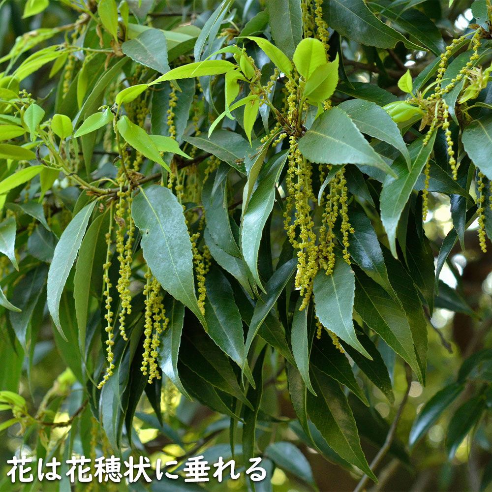 【シラカシ】 読み:しらかし 学名:Quercus myrsinifolia ブナ科コナラ属 常緑高木 【商品情報】 シラカシは綺麗な緑が特徴で生垣によく使われる樹種です。アラカシと比べて樹形が大人しく、葉が細いです。秋になるとかわいい帽子をかぶったドングリを10月ごろに実らせます。一年中緑色の綺麗な葉が付いています。風に強く防火性も高いために、古来から家を守る為に生垣や防風林に使われたりします。自然樹形が非常に綺麗なためシンボルツリーとしても使われます。