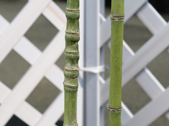 【タケ/ホテイチク】(竹/布袋竹) 学名:Phyllostachys aurea Carr.ex.A.Ruv.et C.Riv. イネ科マダケ属 常緑高木 別名:コサンダケ 【名前の由来】 幹の膨らみ方が七福神の布袋様のお腹のようだから 【商品情報】 竹は古来から親しまれてきた品種です。日本全国に自生しています。常緑高木で大きい物は数十メートルになります。地中根から繁殖しますが、数十年〜150年程度に一度種がなり一斉に枯れます。繁殖力は旺盛です。タケノコができます。庭園にもよく利用され、大小様々な園芸品種が多くあります。