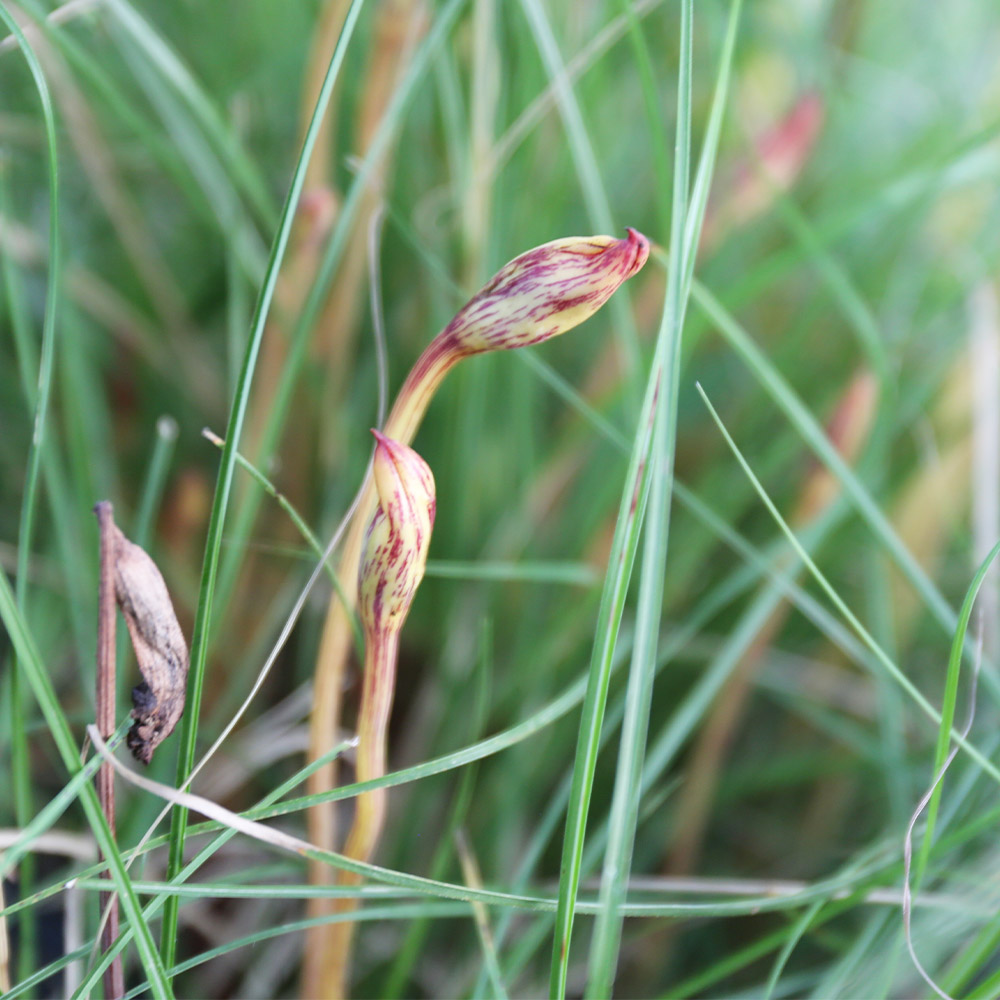【ナンバンギセル】(南蛮煙菅) 読み:なんばんぎせる 学名:Aeginetia indica ハマウツボ科ナンバンギセル属 多年草 別名:オモイグサ 【名前の由来】 花の形が南蛮渡来のキセルに似ていることから 【商品情報】 ナンバンギセルは0.2mになる一年草です。日本、東アジアに自生しています。葉は三角形の鱗片状です。花は筒状で横向きに咲きます。茎は赤茶色か、黄色に細かな茶色の模様が入るものがあります。他の植物に寄生して養分を取りながら生育します。ススキやミョウガなどに寄生します。葉緑素がないので自分だけでは光合成をして成長できません。