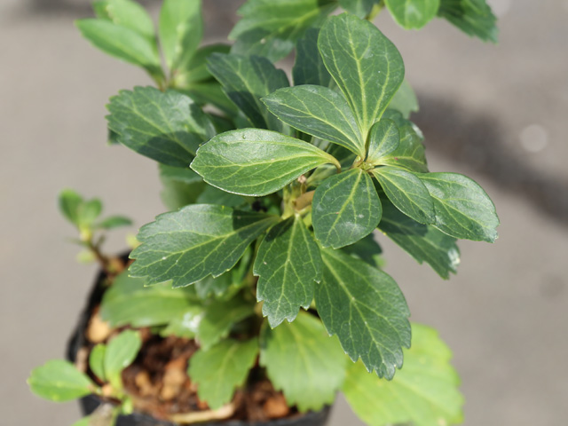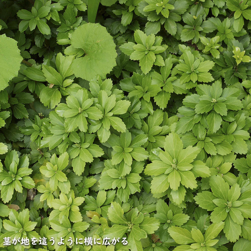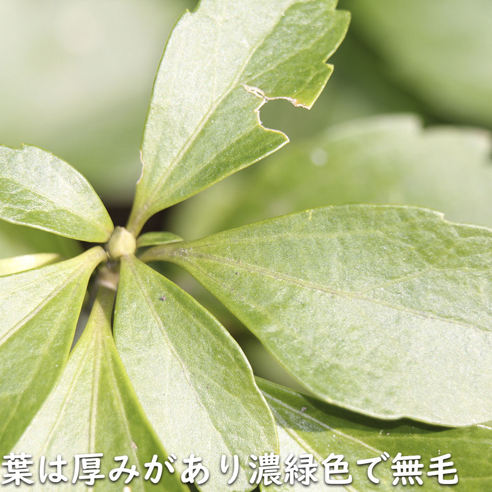 【フッキソウ】(富貴草) 読み:ふっきそう 学名:Pachysandra terminalis ツゲ科フッキソウ属 常緑低木 【商品情報】 フッキソウは30cm程度になる常緑低木です。年中青々としていて、繁殖力も強いためグランドカバーに多様されます。葉は大きさは小さいですが、綺麗な緑色です。花は春に白い小さな花が咲きます。秋になると乳白色の小さな実が少量なります。よく茂るため繁栄の象徴として、このような名前が付いています。