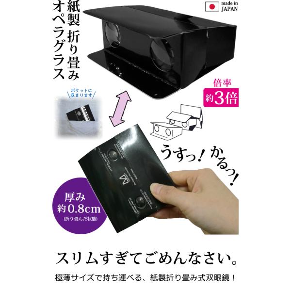スリムになる折り畳み双眼鏡! *折り畳み/ペーパー製/国産/ペーパーオペラグラス/ペーパー双眼鏡/拡大/エコ/SDGs/ペーパー/極薄/極軽/極小/小型/畳める/ミニ双眼鏡/持ち運び/携帯/プラレンズ/プラスチックレンズ/高精度プラレンズ/ミニサイズ/スリム/スマート/薄型/軽量/コンパクト/実用的/バードウォッチング/観測/星座/観察/音楽/鑑賞/舞台/ライブ/コンサート/フェス/音楽鑑賞/劇場/観劇/演劇/オペラ/ミュージカル/バレエ/劇/ショー/発表会/運動会/大会/スポーツ観戦/動物園/水族館/植物園/美術館/博物館/イベント/アウトドア/旅行/観光/お花見/紅葉/展望台/遠足/修学旅行/海外旅行/遠征/推し活/お土産/ギフト/プレゼント/プチギフト/記念品/粗品/餞別/お別れ/感謝/退院祝い/同封できる/同封用/差し入れ/贈り物/配布用/景品/備品/便利グッズ/防災用/常備/予備用/観客用/省スペース/軽量化/山登り/ハイキング/日本土産/父の日/母の日/敬老の日/誕生日/子供の日/理科/道具/旅行グッズ/旅行用品/船旅/訪日外国人/観光客/黒色/機能的*