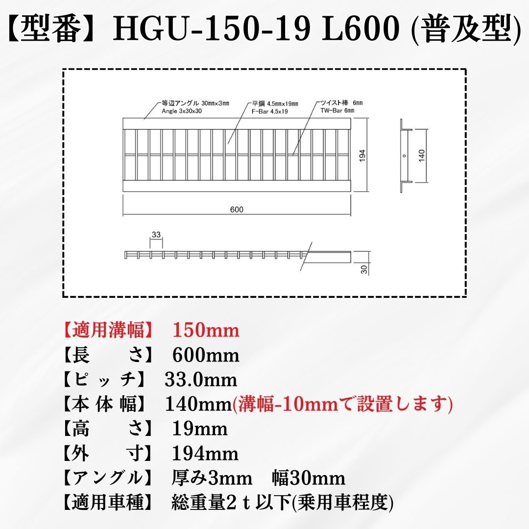 グレーチング U字溝 HGU-150-19L600 溝幅150mm用 乗用車荷重 規格 T-2 溝 蓋 側溝 普及型 並目 L600 法山本店