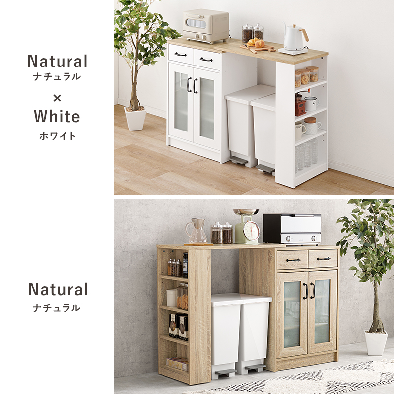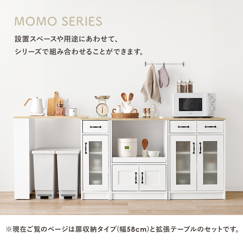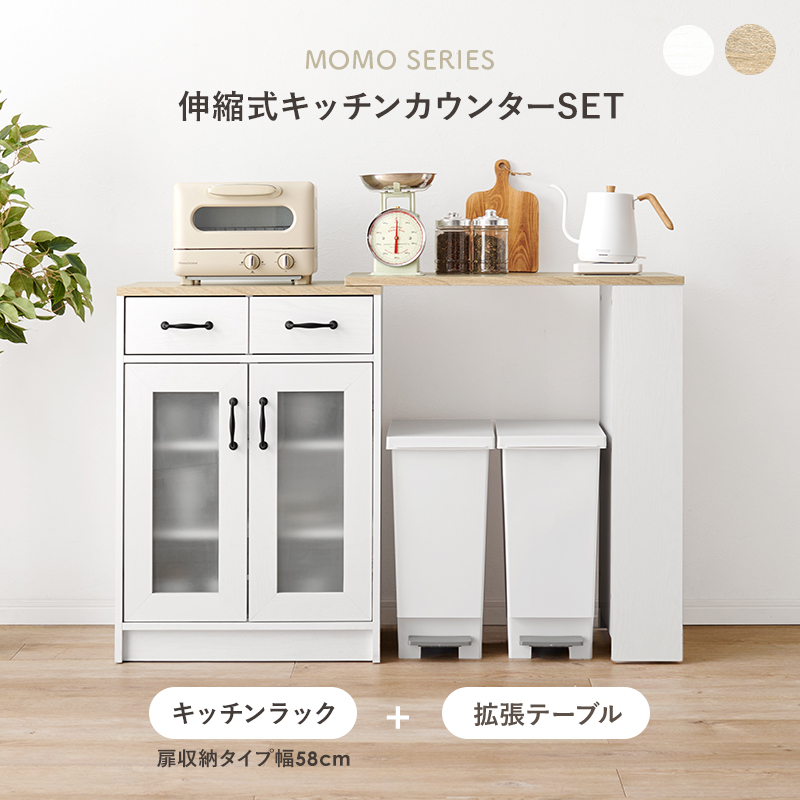 伸縮ラック キッチン キッチンラック 棚 キッチンカウンター 伸縮 キッチンカウンター 天板 拡張 食器棚 ロータイプ キッチン収納棚 扉付き 白 キッチン台 モモ