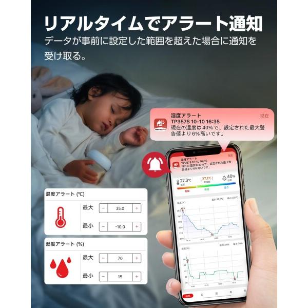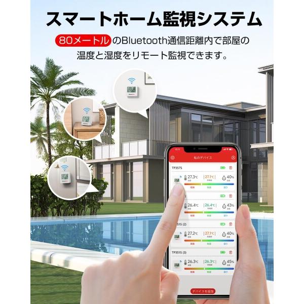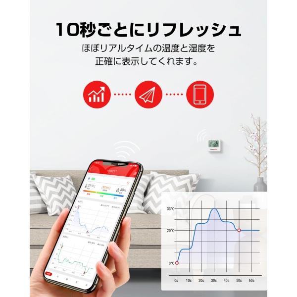 【高精度センサー搭載】Bluetooth温度計湿度計は、スマート温度湿度センサーを搭載し、温度測定は +/-0.5 [度]、湿度測定は +/-2% RH の高精度に達し、より正確な温度や湿度を管理できます。データは10秒ごとにリフレッシュし、室内環境の最新変化をいつでも把握できます。(注意:温湿度差の大きい場所に急に移動すると、リフレッシュに時間がかかりますので、30〜60分待つことをお勧めします。)