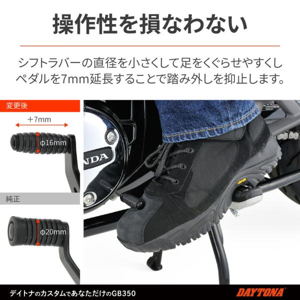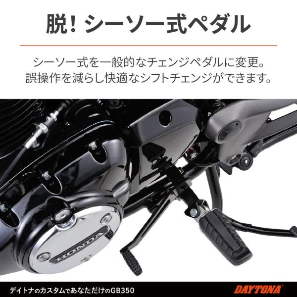 【適合車種】GB350(※Sモデル不可) 【適合年式】2021年 【商品説明】シーソー式から、通常のチェンジペダルに変更。操作感が向上! ●純正のシーソー式から変更することで「うっかりかかとでシフトアップ」のようなミスを防げます。 ●また、チェンジペダル位置を見直し、シフトラバー部の直径φ20mmをφ16mmに小さくすることで、シフトアップの操作感を向上させました。 ●アーム部はスポーティ感あるデザインになっています。