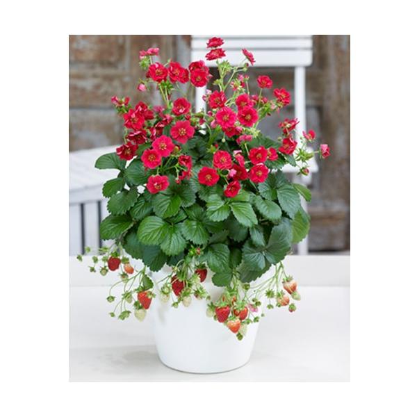 イチゴ「ローズベリー・レッド」は、珍しい赤花のイチゴで、バラのような花が次々と咲き、見て、食べて楽しめる新品種のイチゴです!咲き姿も実り姿も美しい! 多花性でも確実に着果。小鉢でも収穫できビギナーに最適。四季なり品種で長く収穫が可能。