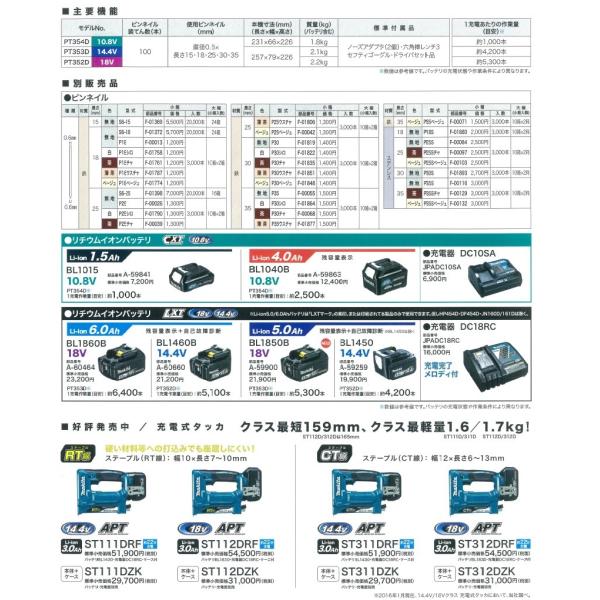 makita マキタ 10.8V充電式ピンタッカ PT354DSH(1.5Ahバッテリ・充電器・ケース付)