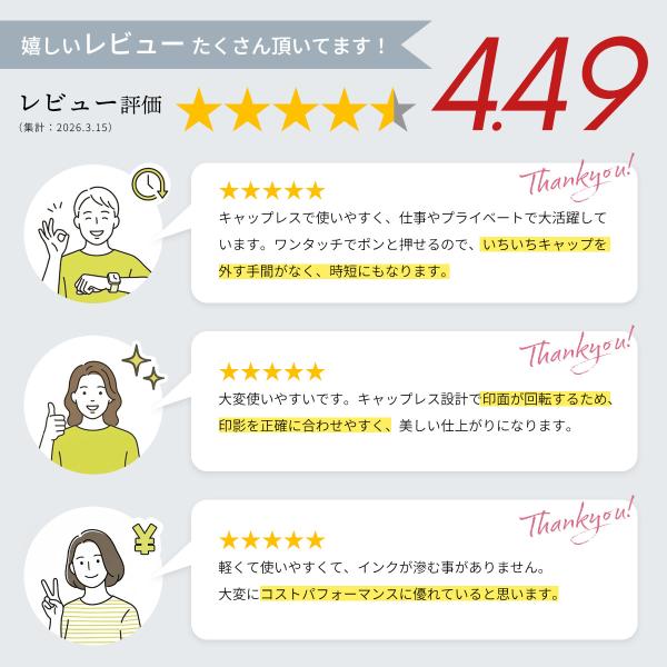 キャップレス仕様で片手でスムーズに押印可能。回転式機構により、押すたびに印面が回転し、快適な押し心地を実現します。