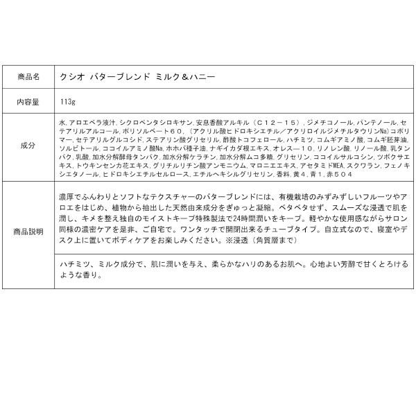 柔らかな肌触りでベタつかず、お肌にしっとりとした潤いをもたらすクシオのバターブレンド。モイストキープ特殊製法で潤いが24時間続くソフトでふんわりとしたテクスチャーでお肌を優しく包み込みます。ローションでもクリームでもな、こっくりとしたバターならではのボディクリーム。