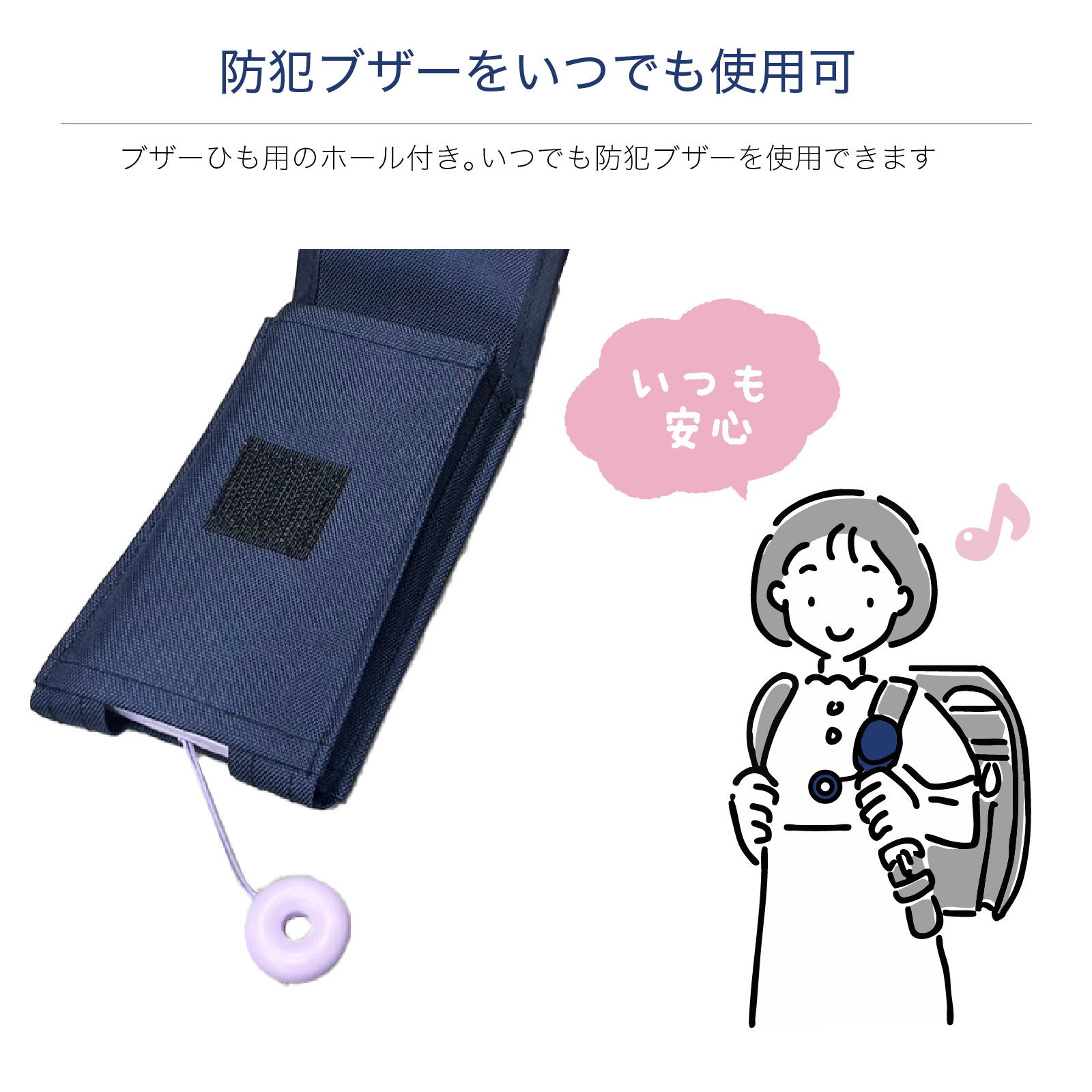 収納の利便性はもちろん、ブザーひも用のホールが付いており、いつでも防犯ブザーを使用できます。