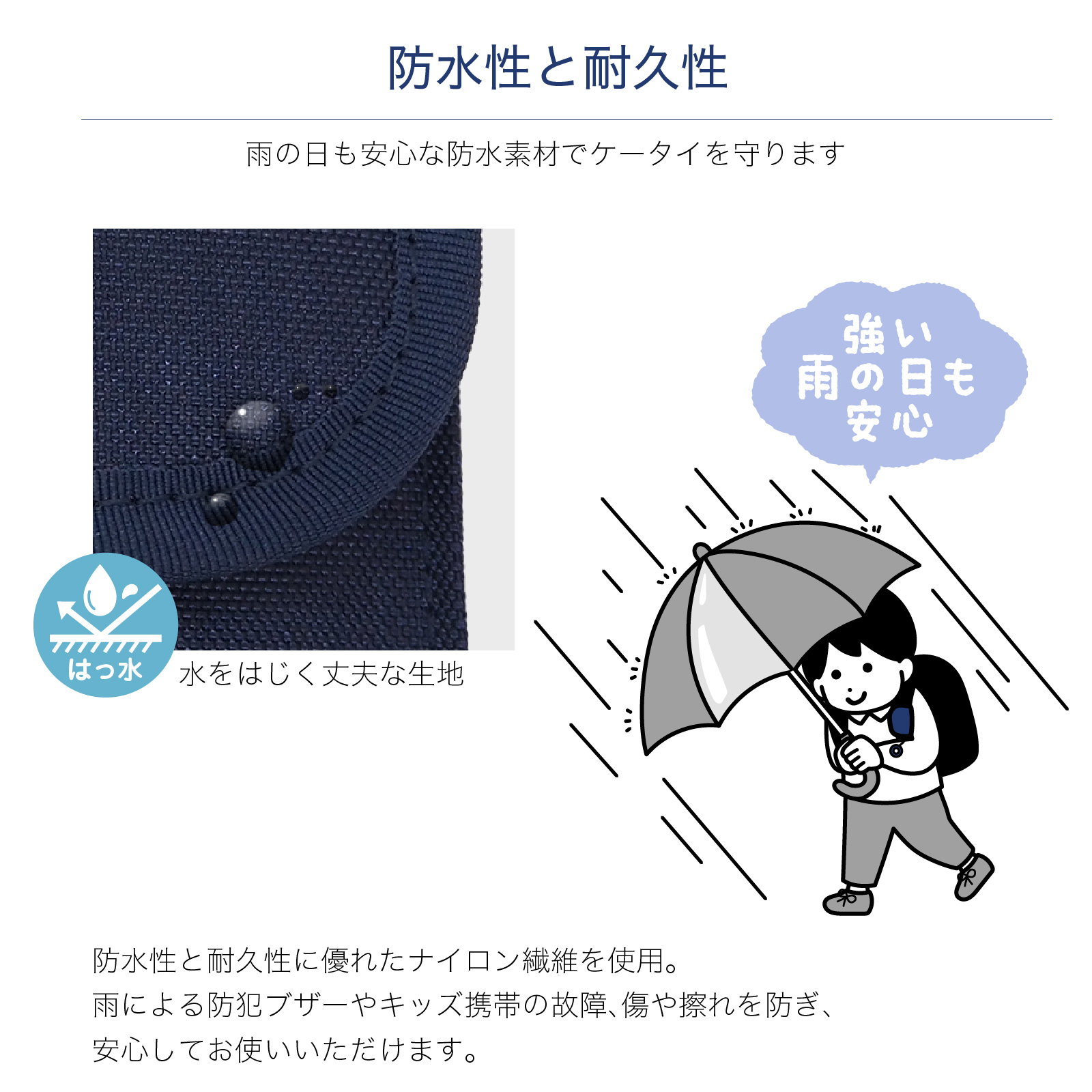 雨による防犯ブザーやキッズ携帯の故障、傷や擦れの心配がなく、安心してお使いいただけます。