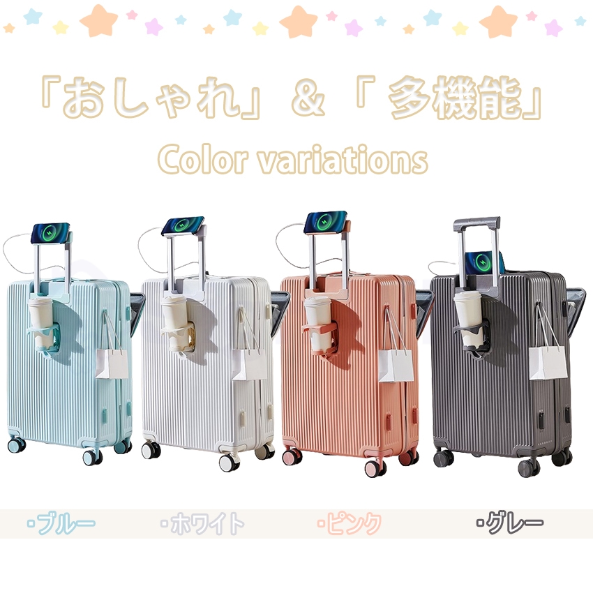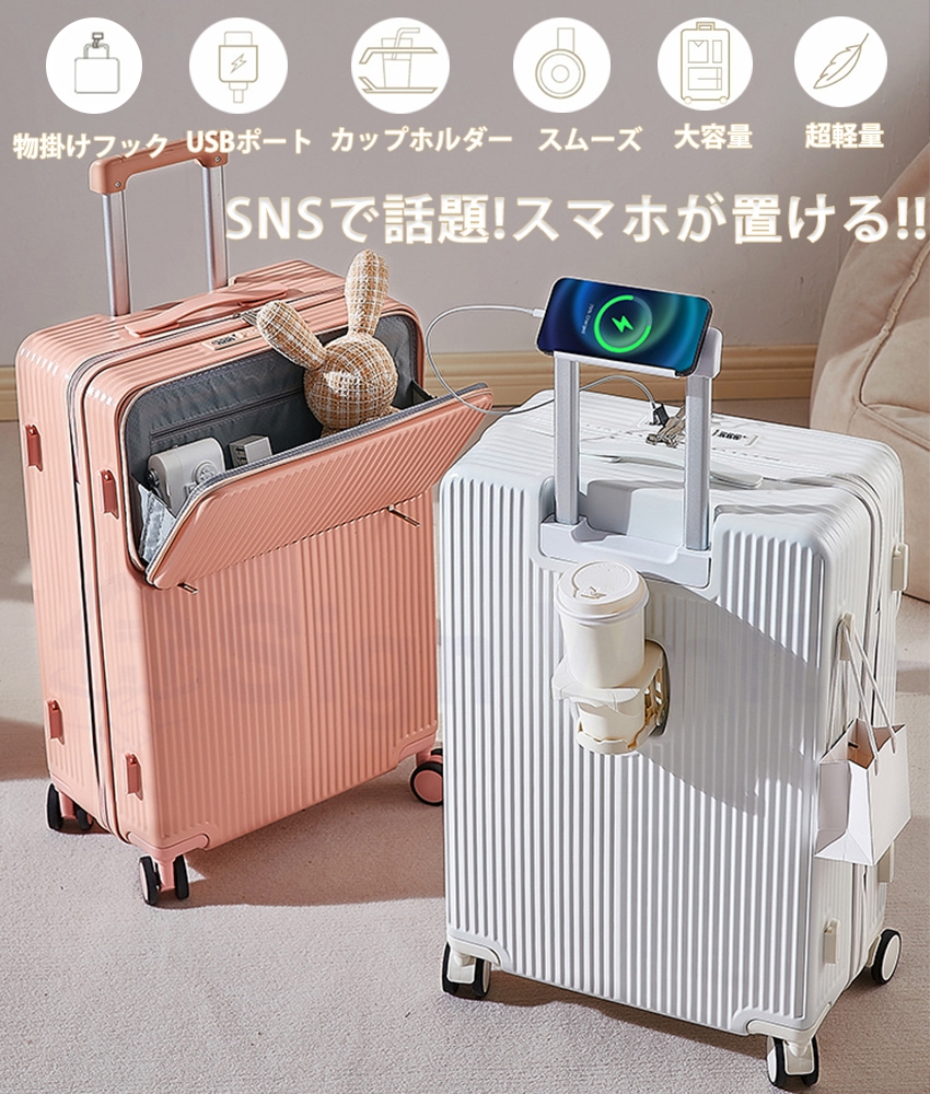 スーツケース 機内持ち込み フロントオープン 多機能スーツケース キャリーケース スマホスタンド 前開き USBポート付き ドリンクホルダー