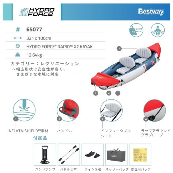 Bestway Hydro Force Rapid X2 インフレータブルカヤック 2人用 2人乗り 空気注入式 エアカヤック カヤックセット アウトドア ベストウェイ 3.21m x 1.00m 65077