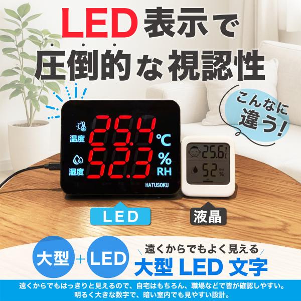 【LED表示で見やすさ抜群】LED表示により、圧倒的な視認性。遠くからでもはっきりと見えるので、家庭はもちろん、オフィスや工場などの職場などでも皆が数値を確認しやすい温湿度計です。