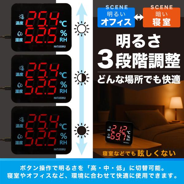 【LEDの明るさ調整機能】LED表示の明るさは3段階に変更可能。照明の明るいオフィスでもはっきりと見やすく、寝室などの暗い部屋でも眩し過ぎずに使いやすくなっています。