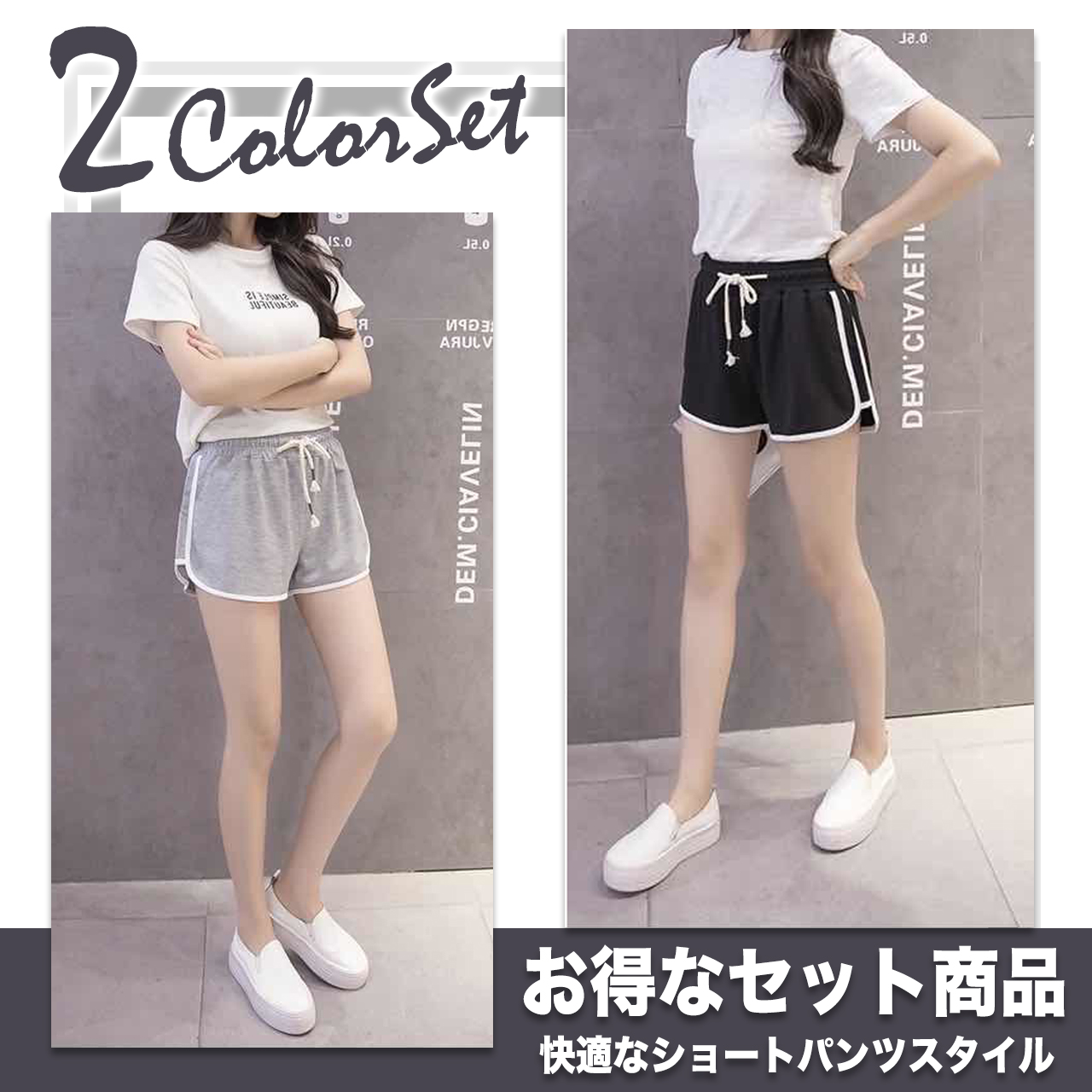 2枚セット ショートパンツ ルームウェア レディース 短パン ウエストゴム スウェット 部屋着 パジャマ サイドライン 黒 グレー