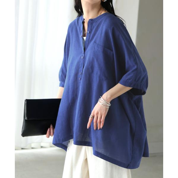 ブラウス オーバーサイズ レディース トップス 涼しい シャツ ロング 半袖 シャツブラウス ノーカラー チュニック 前開き ドルマン リネン混