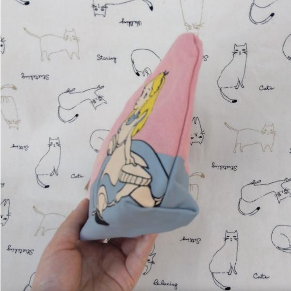 無表情で一点を見つめる(だけど食べ物はしっかり持って食べてる)大人っぽい雰囲気が漂う不思議の国のアリスのポーチです。