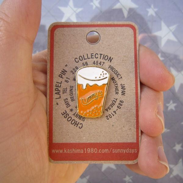 カラフルな傘、ピンクのタイヤが可愛いローラースケート、黄金色の美味しそうなビール、タイプライターのピンズです。