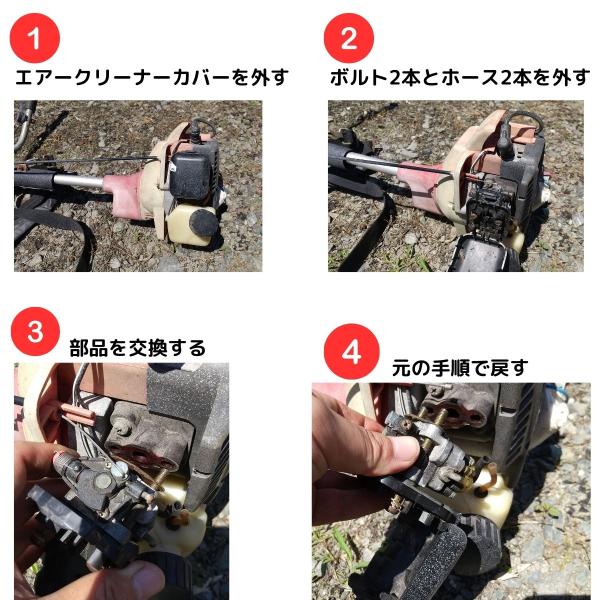 ・エアクリナーカバーのネジ2本、燃料ホース2本、キャブレター下側のネジ4本、こちらを外して交換するだけ