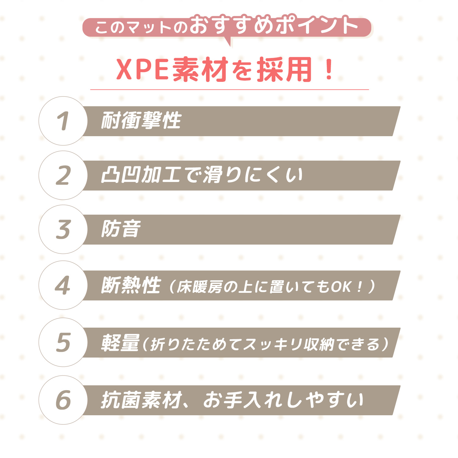 XPE素材は吸水しない素材で、衛生的で高密度、耐衝撃性に強く断熱性に優れています。