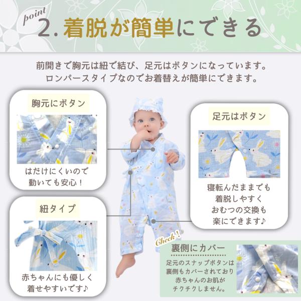ロンパースタイプで着脱しやすく、オムツの交換が楽にできます。
